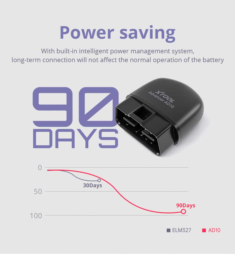 With built-in intelligent power management system, even if the vehicle is parked for 60-90 days after being connected to the AD10, it will not affect the normal driving of the battery. The ordinary ELM327 can only persist for 30 days.