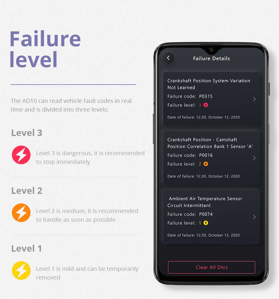 The AD10 can read the vehicle error codes in real time and divides the error codes into three levels.